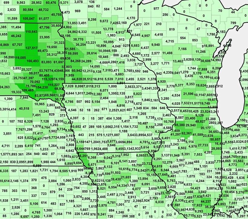 Here is an interesting photo of Prevented Planting in acres by County.